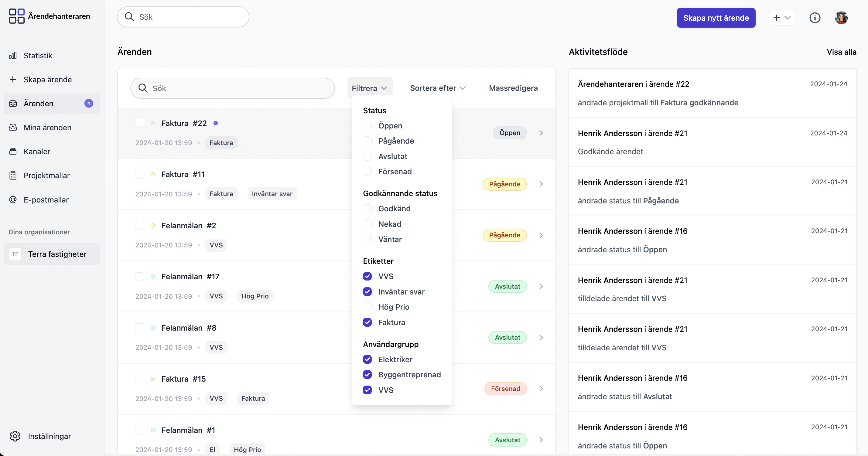 Logga in i Ärendehanteraren och gå till Kanaler. Klicka på Skapa kanal, ge kanalen ett namn (t.ex. Felanmälan eller Kontakta oss) och välj Formulär som kanaltyp. Spara.